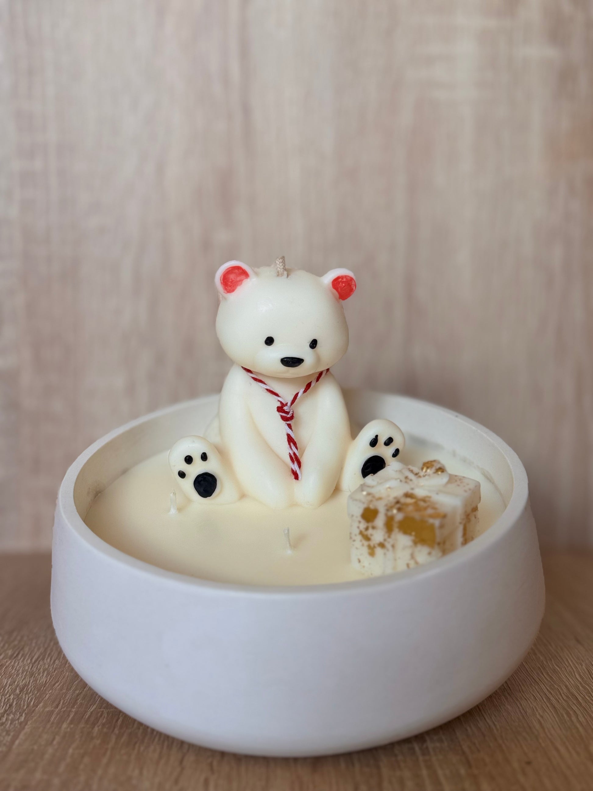 La vela Abrazo Polar captura la ternura del invierno en una escena encantadora: un pequeño osito blanco descansa sobre una suave base de cera, transmitiendo calma y dulzura. Su diseño invita a detener el tiempo y disfrutar del calor del hogar mientras fuera cae la nieve.