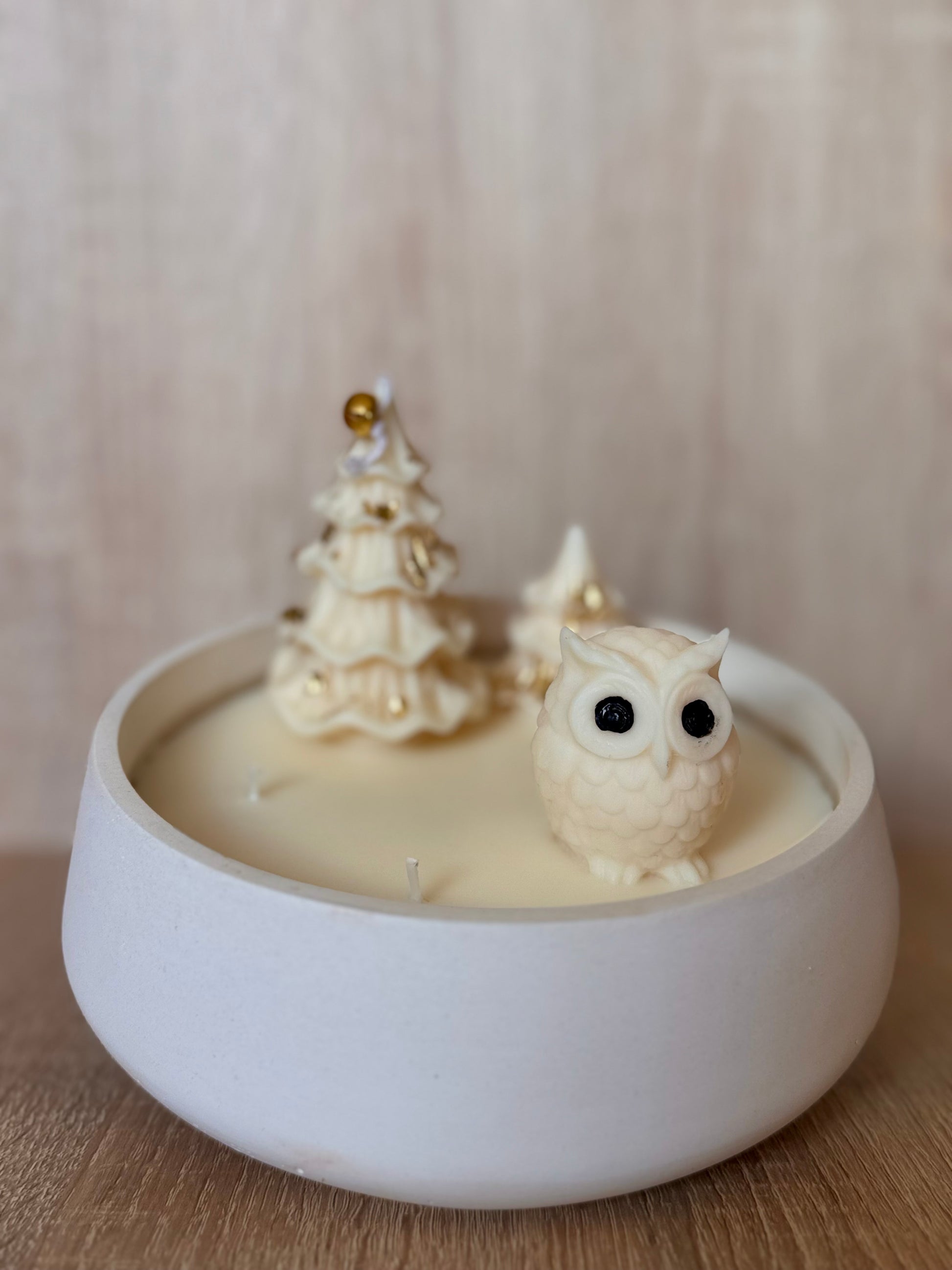 La vela Bosque Invernal encierra la magia serena del invierno en una escena encantadora: un pequeño búho reposa sobre una superficie nevada de cera, rodeado de delicados abetos que evocan un bosque cubierto de escarcha. Su diseño transmite calma, sabiduría y la quietud de una noche invernal iluminada por la luz suave de las velas.