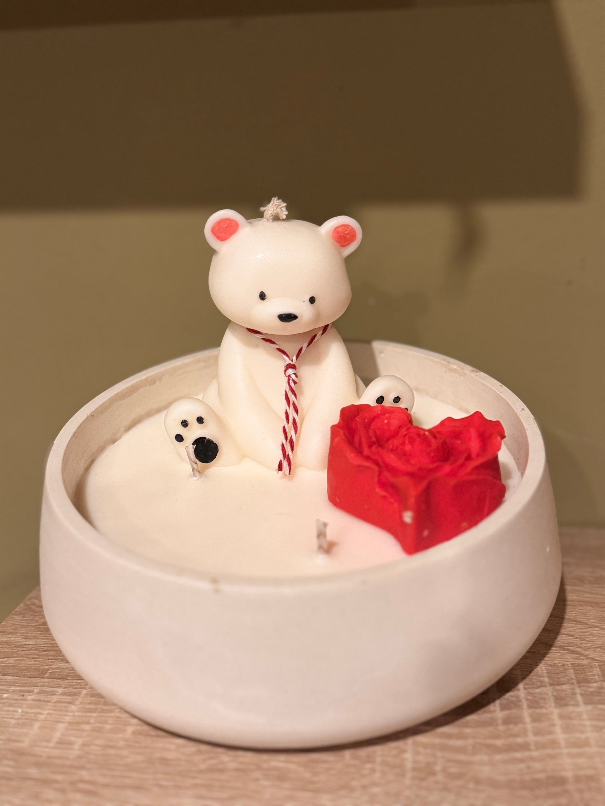 Esta encantadora vela artesanal representa la dulzura del amor en su forma más tierna. En el centro, un adorable osito blanco emerge suavemente, rodeado de delicados detalles y acompañado de una rosa roja, símbolo eterno del amor y la pasión.
